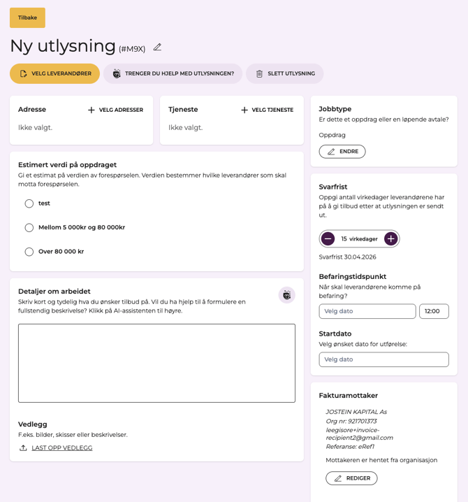 Her oppretter man en ny utlysning for å innhente tilbud fra leverandører. Start med å velge adresse og tjenestekategori, og angi estimert verdi på oppdraget – dette bestemmer hvilke leverandører som mottar forespørselen. Under «Detaljer om arbeidet» beskriver man kort hva oppdraget gjelder, og man kan laste opp relevante vedlegg som bilder, skisser eller beskrivelser.