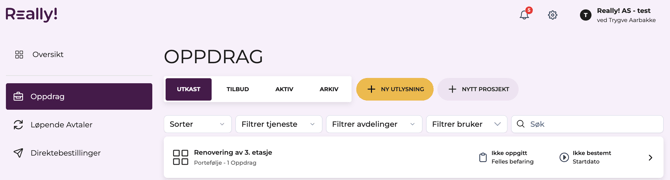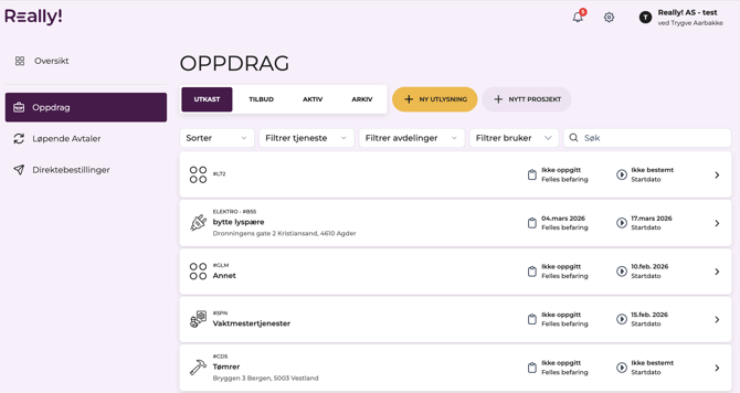 På denne siden får man oversikt over alle oppdrag i organisasjonen. Oppdragene er delt inn i fire faner: «Utkast» viser oppdrag som er påbegynt men ennå ikke sendt ut, «Tilbud» viser oppdrag der man avventer tilbud fra leverandører, «Aktiv» viser pågående oppdrag som er signert og startet, og «Arkiv» inneholder fullførte eller avsluttede oppdrag. Man kan opprette nye oppdrag via «Ny utlysning» eller «Nytt prosjekt», og filtrere listen etter tjeneste, avdeling eller bruker for å enkelt finne frem til relevante oppdrag.