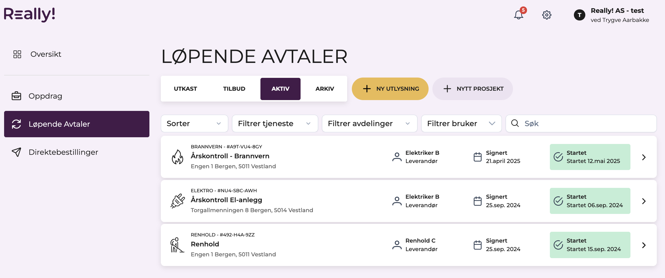 Denne siden har samme oppbygging som Oppdrag. Her får man oversikt over alle løpende avtaler i organisasjonen, altså avtaler som har en definert start- og sluttdato. Avtalene er delt inn i fire faner: «Utkast» viser avtaler som er påbegynt men ennå ikke sendt ut, «Tilbud» viser avtaler der man avventer tilbud fra leverandører, «Aktiv» viser pågående avtaler som er signert og startet, og «Arkiv» inneholder fullførte eller avsluttede avtaler. Man kan opprette nye avtaler via «Ny utlysning» eller «Nytt prosjekt», og filtrere listen etter tjeneste, avdeling eller bruker for å enkelt finne frem til relevante avtaler.