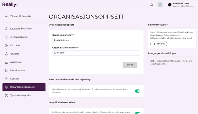 På denne siden kan man konfigurere grunnleggende informasjon om organisasjonen, som organisasjonsnavn og organisasjonsnummer. I tillegg kan man aktivere eller deaktivere en rekke funksjoner etter behov, blant annet bekreftelseskode ved signering, eksterne avtaler, porteføljeutlysninger, direktebestillinger og kontoadministrasjon. På høyre side kan man også sette opp fakturamottaker og administrere integrasjonsinnstillinger.
