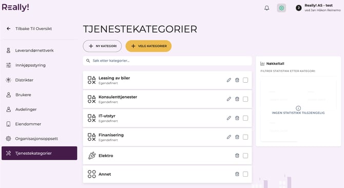 På denne siden kan man bygge opp sitt eget kategoritre for tjenester. Man kan enten opprette helt egendefinerte kategorier ved å trykke «Ny kategori», eller velge blant våre ferdigdefinerte standardkategorier via «Velg kategorier»-knappen. Hver kategori kan redigeres ved å trykke på blyant-ikonet eller slettes ved å trykke på søppelbøtte-ikonet. På høyre side vises nøkkeltall og statistikk filtrert etter valgt kategori.