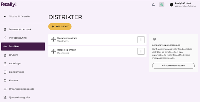 På denne siden kan man opprette og administrere geografiske distrikter for organisasjonen. Trykk på «Nytt distrikt»-knappen for å legge til et nytt distrikt, der man definerer området ved hjelp av postnumre. Dette gir muligheten til å ha lokale leverandører som kun skal levere tjenester innenfor det avgrensede området i det valgte distrikt. Hvert distrikt viser antall tilknyttede postnumre, og kan redigeres via menyknappen (⋮) til høyre.
